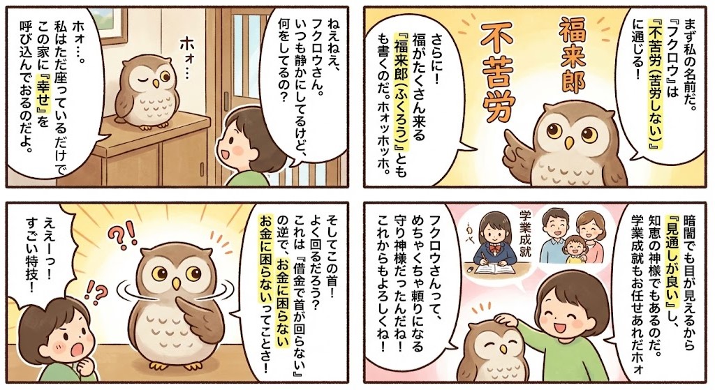など縁起のよい吉祥な当て字が充てられる事から幸福を招くと言われており西洋でもギリシャ神話では女神アテナの使い、ローマ神話ではミネルヴァの使いとして「知恵・文学の神様」と崇められているため学生や受験生のお守りとしても人気があります